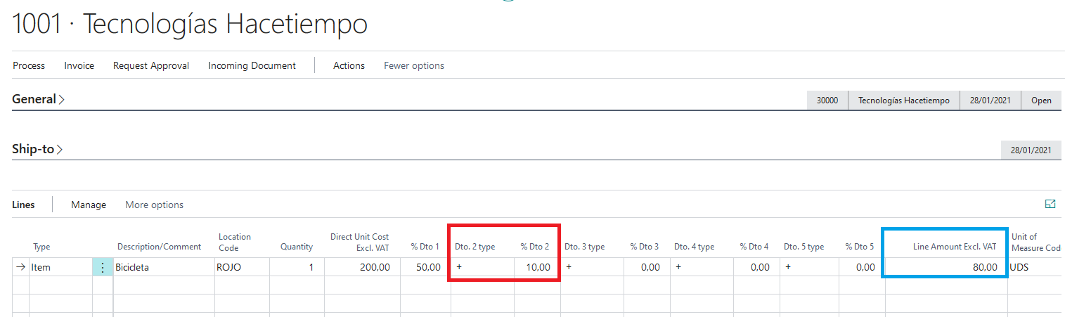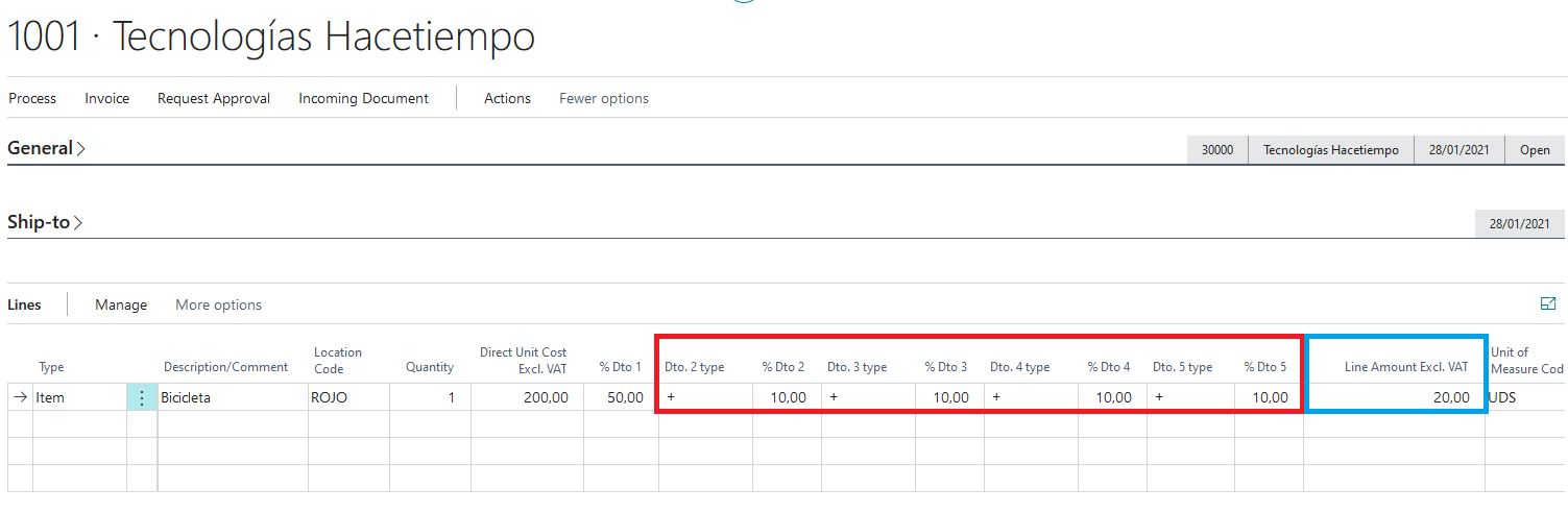 Como vemos, el coste unitario del producto son 200€, al que le hemos añadido un primer descuento del 50% sobre esa base "% Dto 1", de modo que el importe de la línea con el descuento aplicado son 100€.
