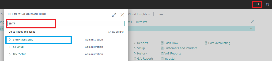 Desde el buscador de Business Central accedemos "Configuración correo SMTP".